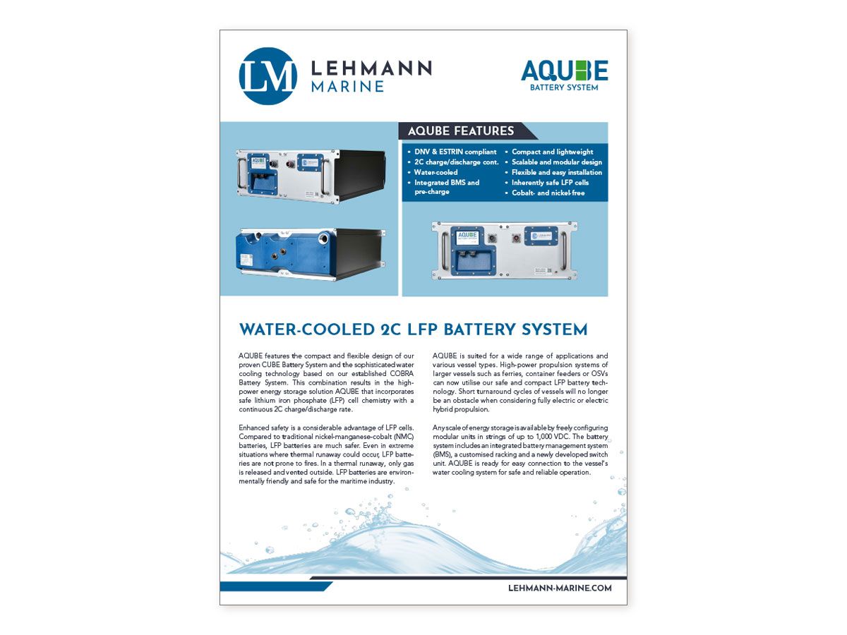 Any scale of energy storage is available by freely configuring modular units in strings of up to 1,000 VDC. The battery system includes an integrated battery management system (BMS), a customised racking and a newly developed switch unit. AQUBE is ready for easy connection to the vessel‘s water cooling system for safe and reliable operation.