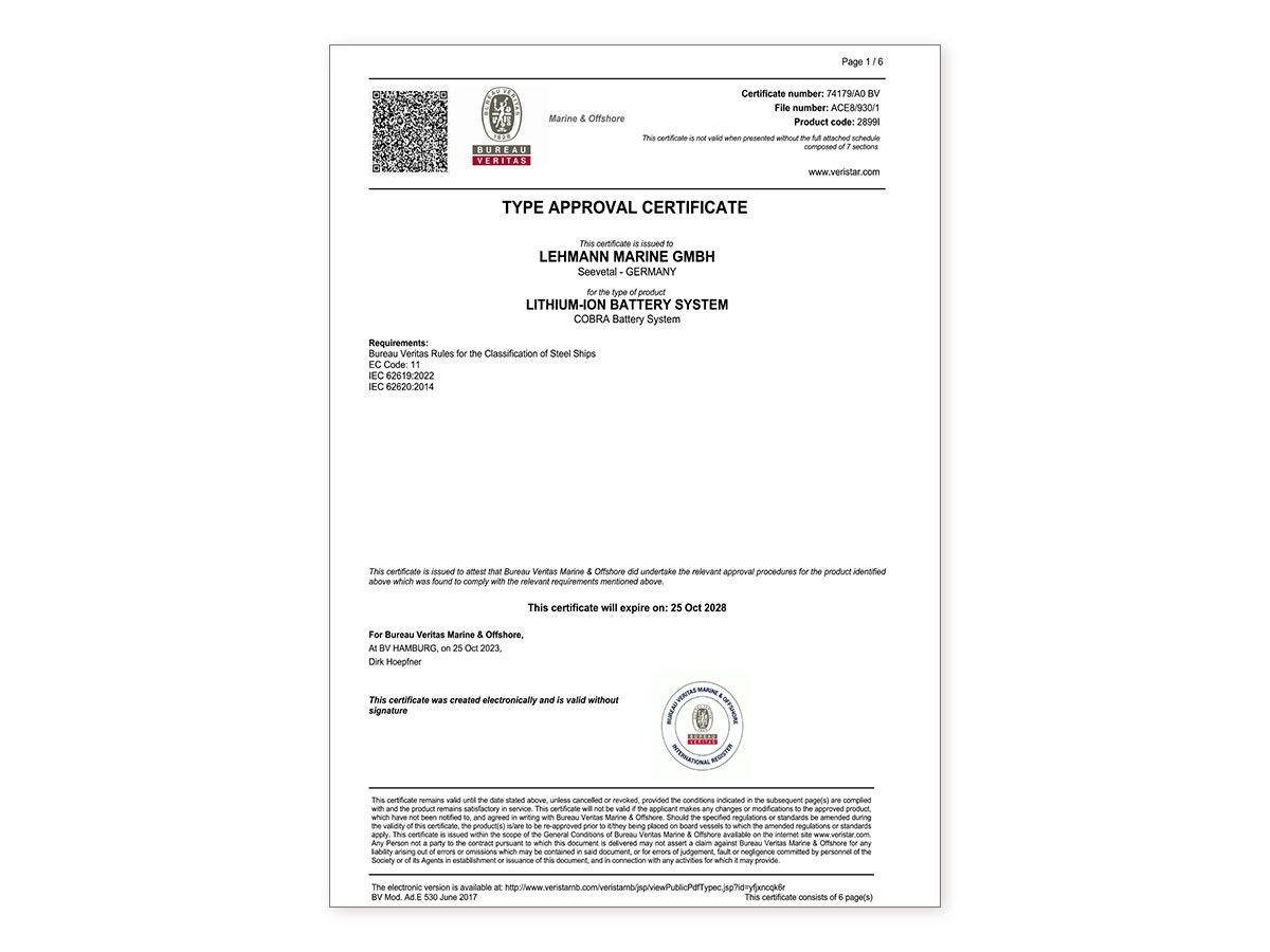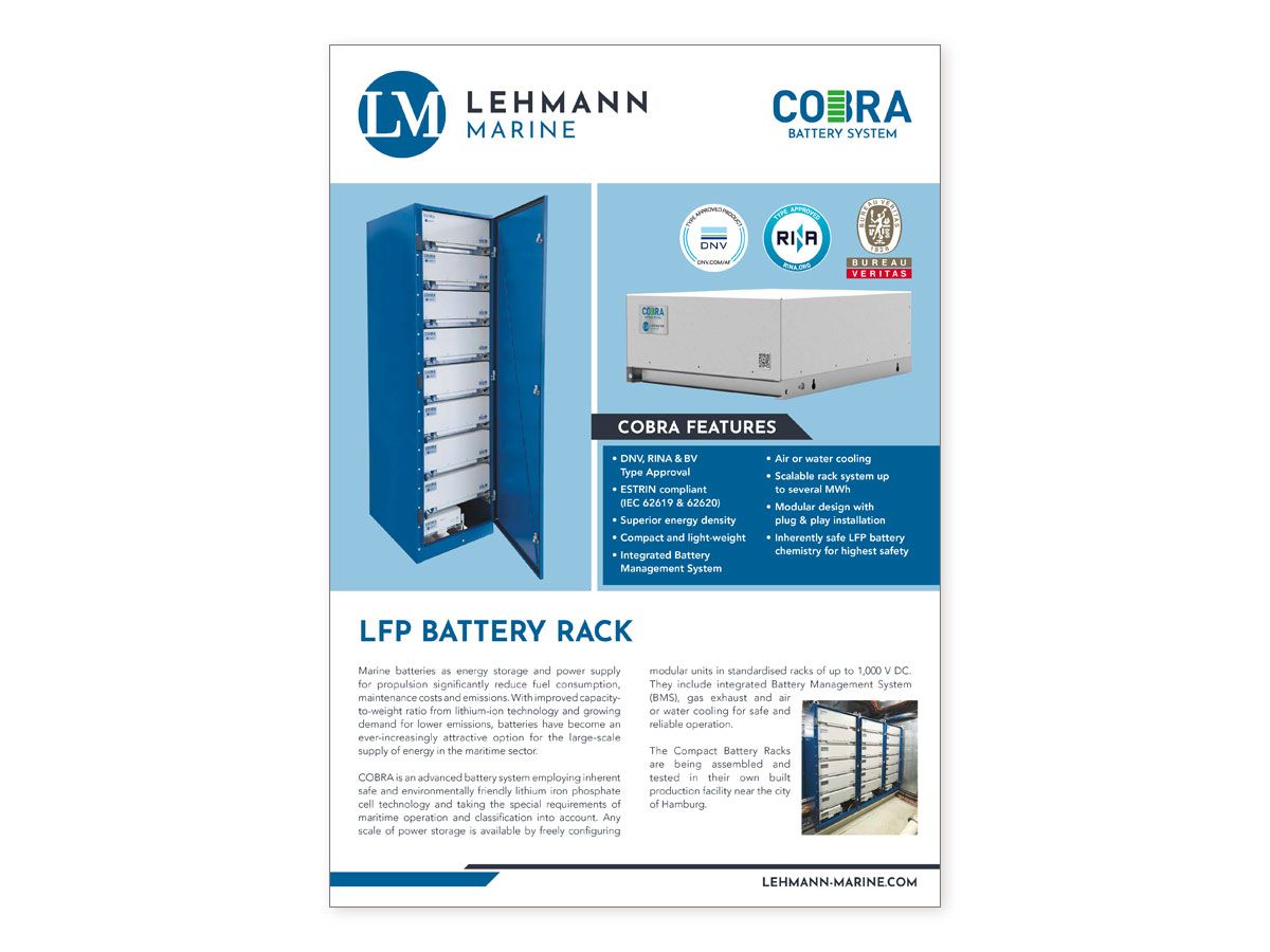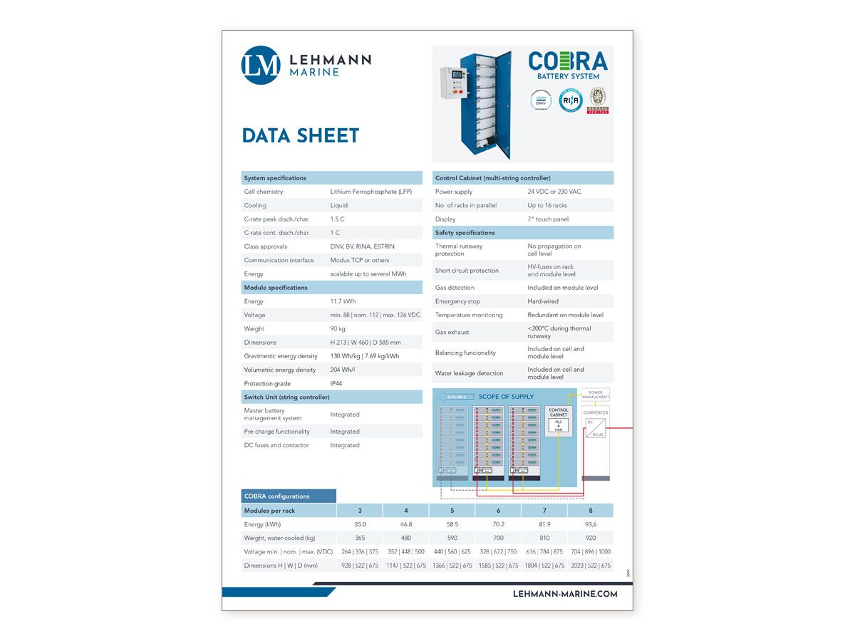 COBRA is an advanced battery system employing inherently safe lithium iron phosphate (LFP) cell technology. Any scale of power storage is available by freely configuring modular units in standardised racks of up to 1,000 VDC including efficient water or air-cooling and a battery management system. COBRA is type-approved by Bureau Veritas, DNV & RINA and complies with ESTRIN.