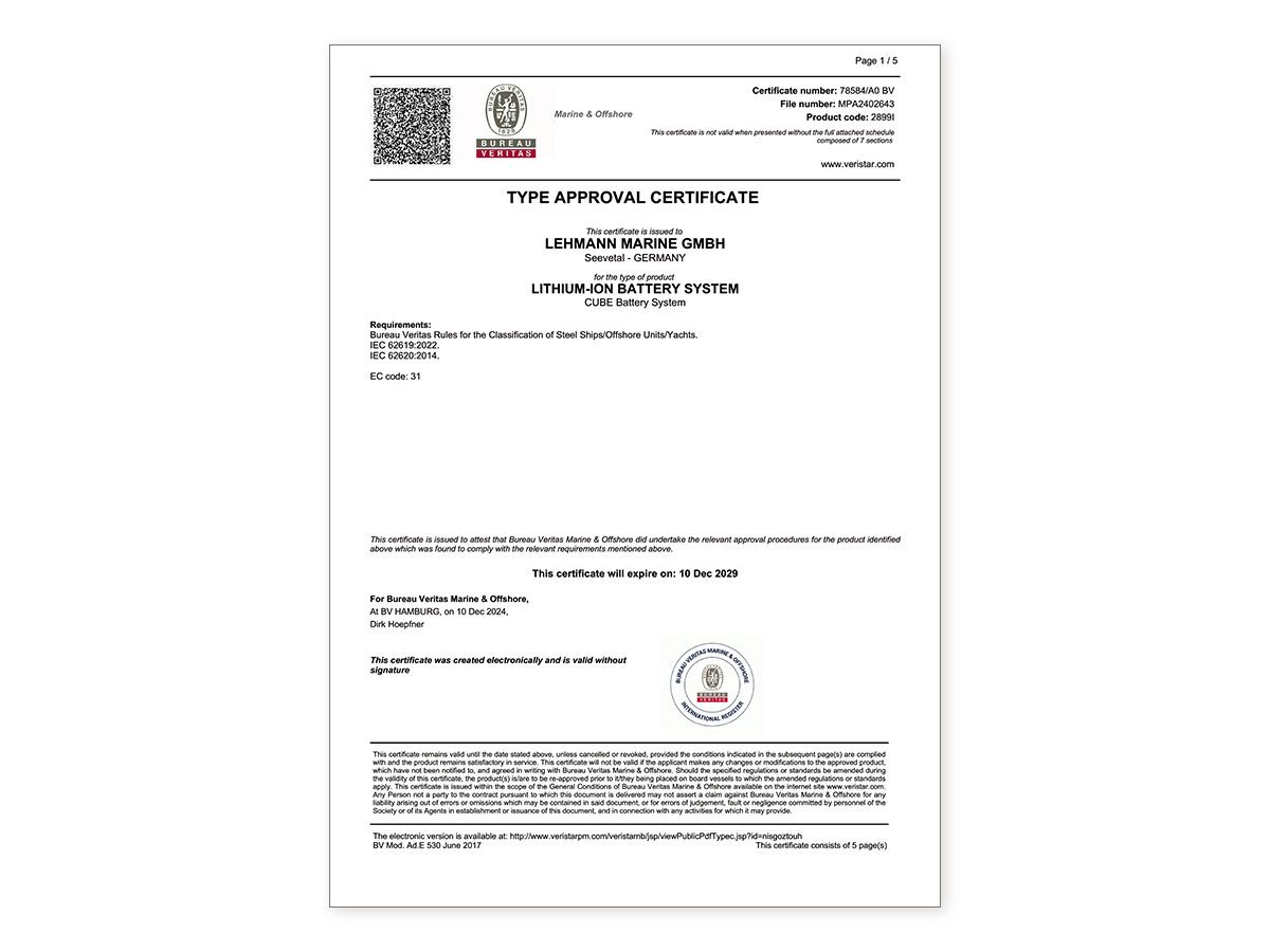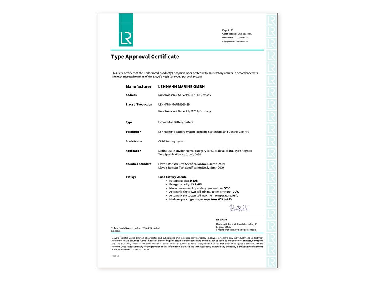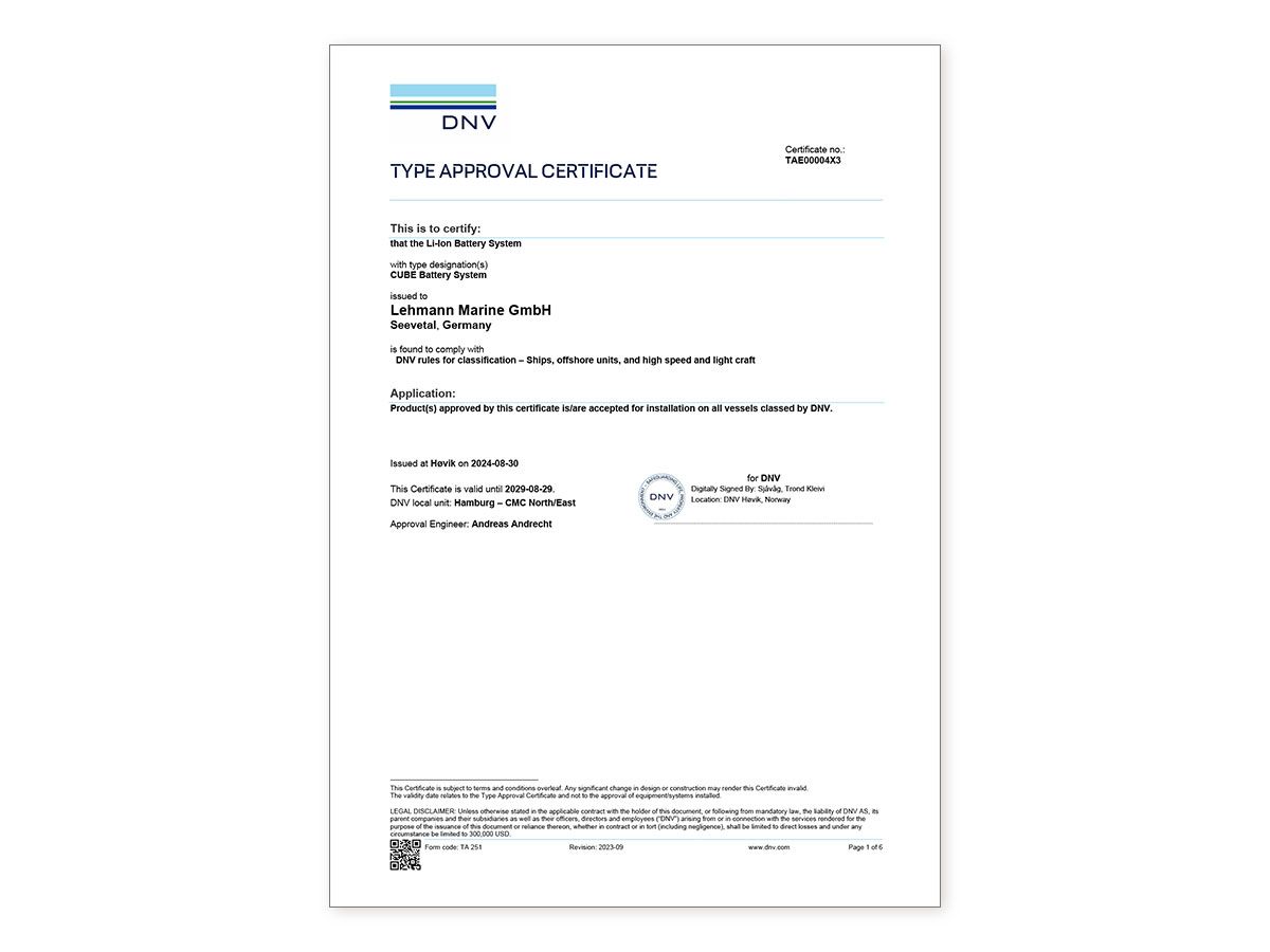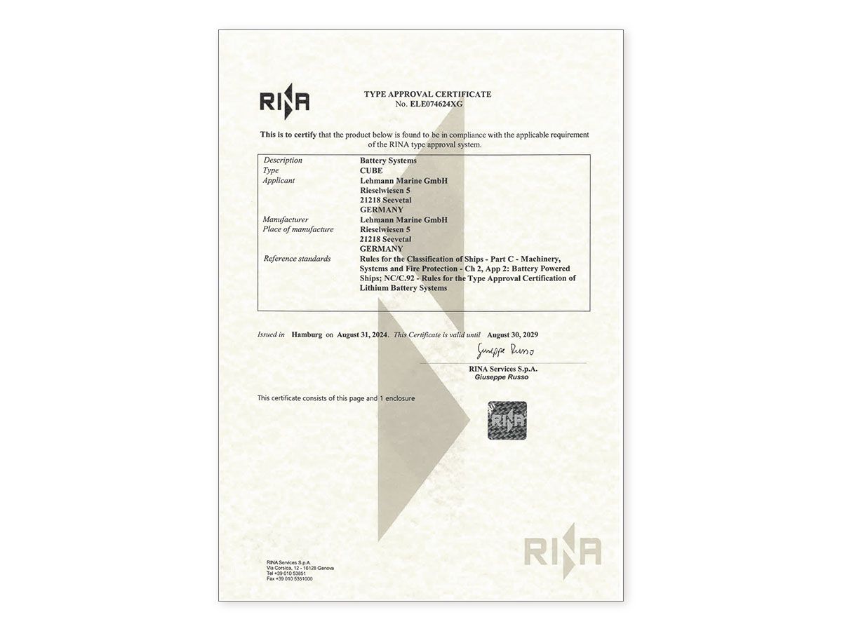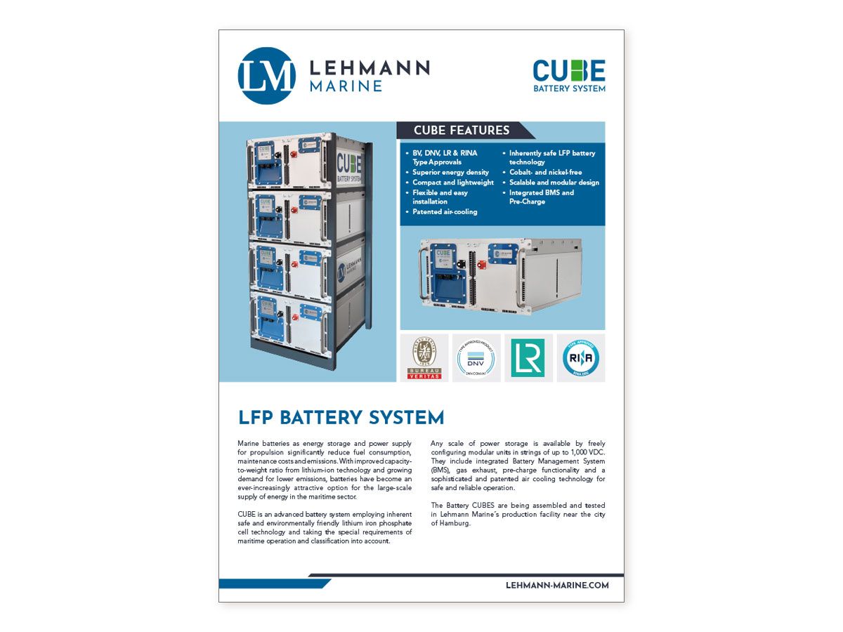 LFP battery cells and permanent monitoring by the Battery Management System on cell, module and on string levels guarantees the highest standards for safety. LFP battery chemistry does not catch fire during thermal runaway, short-circuit or mechanical damage which makes the CUBE system a high-quality solution for the use at sea where safety is essential.